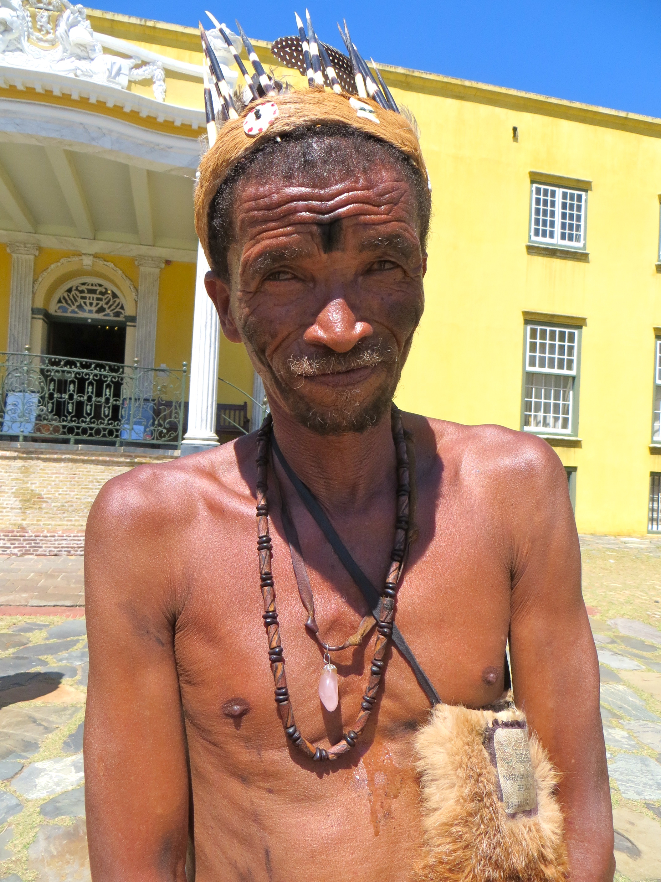 Although they were once the first peoples – the forefathers of all the tribes- which recent research by genetic scientists has proven, the remaining pure blooded bushmen and women I met at the castle felt that their nation was so lost and invisible in the new South Africa that they had the walked in protest all the way from the Kalahari desert to the Castle to remind people of their heritage. To call for their true languages to be taught in schools and to remind us that being classified as ‘coloured” was not a true identity. The Khoi languages are dying. Only a few dialects are still spoken. The few teachers that used to teach their languages have been stopped. They are calling for at least one Khoi or Bushaman language to be made an official language. SA has 11 official languages, not one is a Khoi dialect even though the coat of arms uses Khoi San words. The words on the SA coat of arms are translated as meaning “Unity in diversity”, but according to a prof. Cyril Hromnik, these Xam words have been taken out of context and the true translation is nonsensical. The man I met at the dungeon told me that the group had been invited to Switzerland where they would be addressing the U.N. at a conference in Geneva. I encouraged the Bushman brother on his mission reminding him that in the broader context, they – as one of the earths first peoples could be the leaders in showing people how to survive on the new and ancient path, which requires one to tread lightly on the earth. It is ingrained in the Bushman way of life never to take more than one needs.