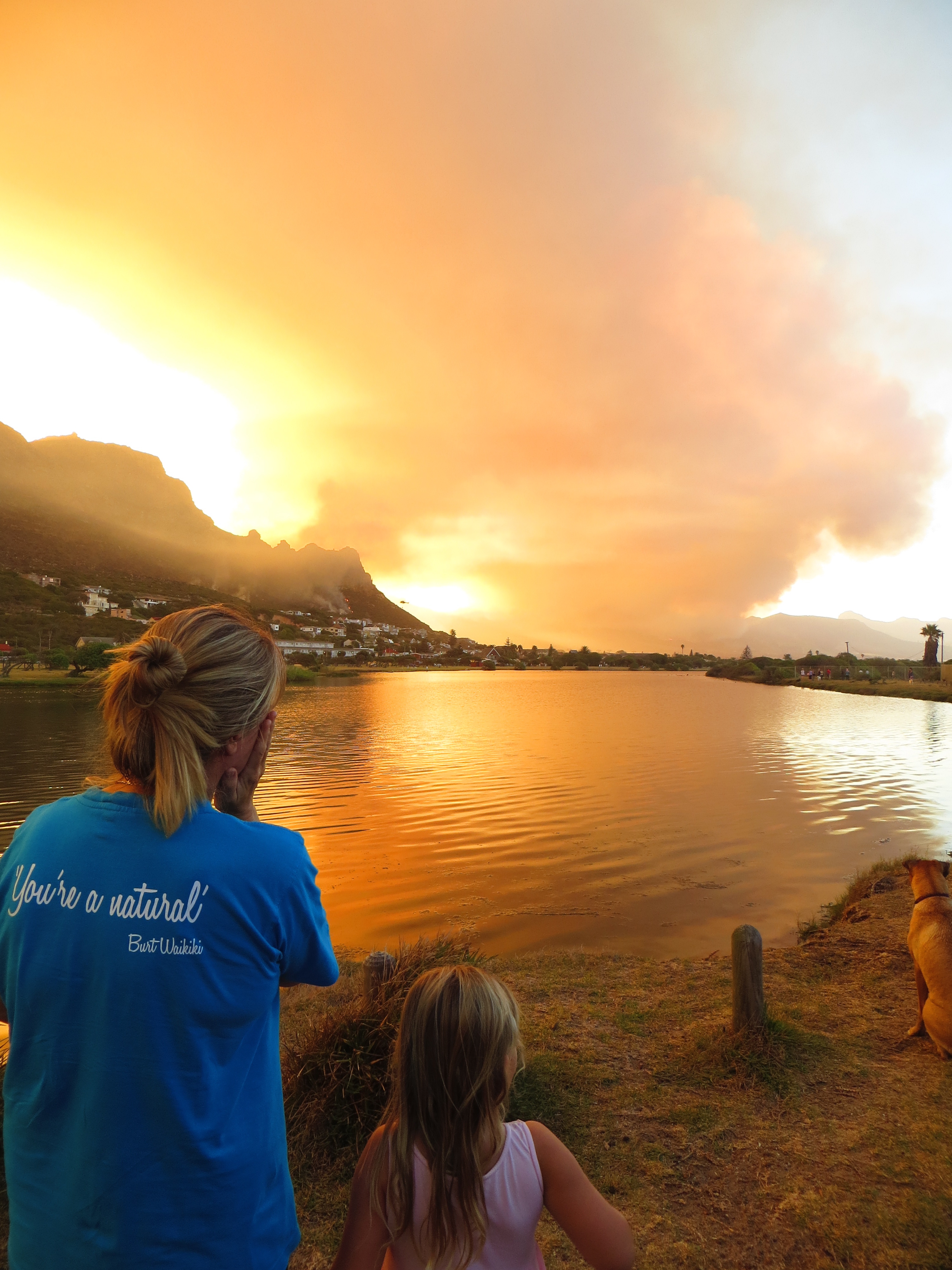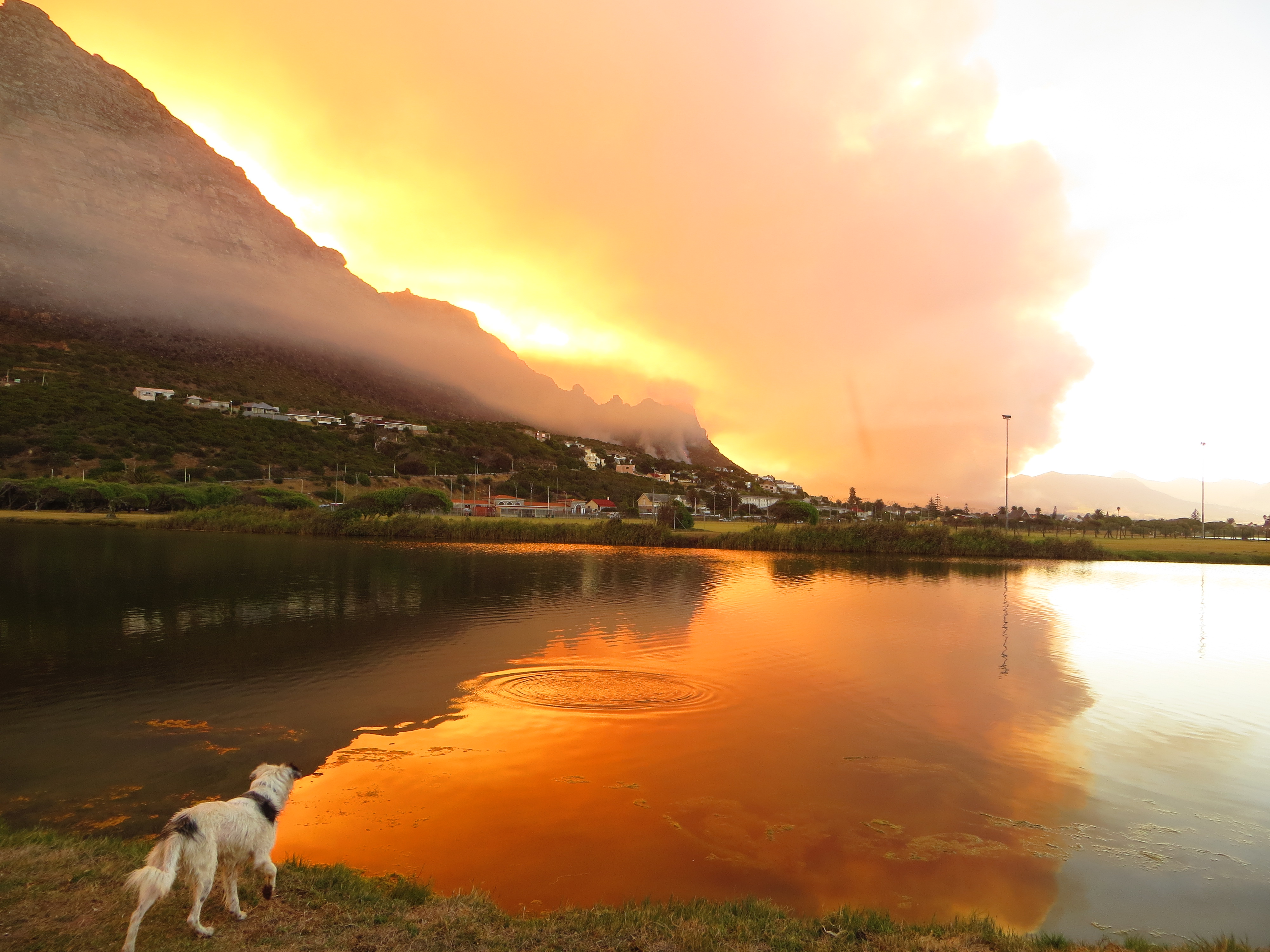 The pollution!” Said the son, as thick black bellows of smoke rose up. “You worried about the pollution?” Marveled the daughter disapprovingly. “Think about the animals! And the people!” “But the pollution is what could have caused this fire in the first place. “ I blurted out, feeling emotional, and started to explain about the predictions of scientists that warned that too much C02 would cause the green house effect (also known as global warming) and that researchers warned that one of the consequences of the warming would be runaway fires and the desertification of the Western Cape due to drought. “We didn’t think we would be effected so soon.” I stressed, realizing as I spoke that this doomful prophecy may already be upon us, “but when the ice-caps melt and the forests burn it becomes a vicious cycle and it speeds up.” “It’s the feedback mechanism. It’s exponential,” agreed another passerby shaking his head. We were warned that things would get bad by 2015 if we did not change our ways and tread more lightly on the earth. “It has been predicted by scientists all over the world, who have been warning us for years.” I explained. The green house effect created by too much polluting Co2 causes extreme temperatures which triggers fires, which create lots of smoke and more Co2. That’s when climate change goes exponential. It’s hard to take any of this seriously when reading the theory, but when nature shows her power and our lives and homes are threatened, priorities change