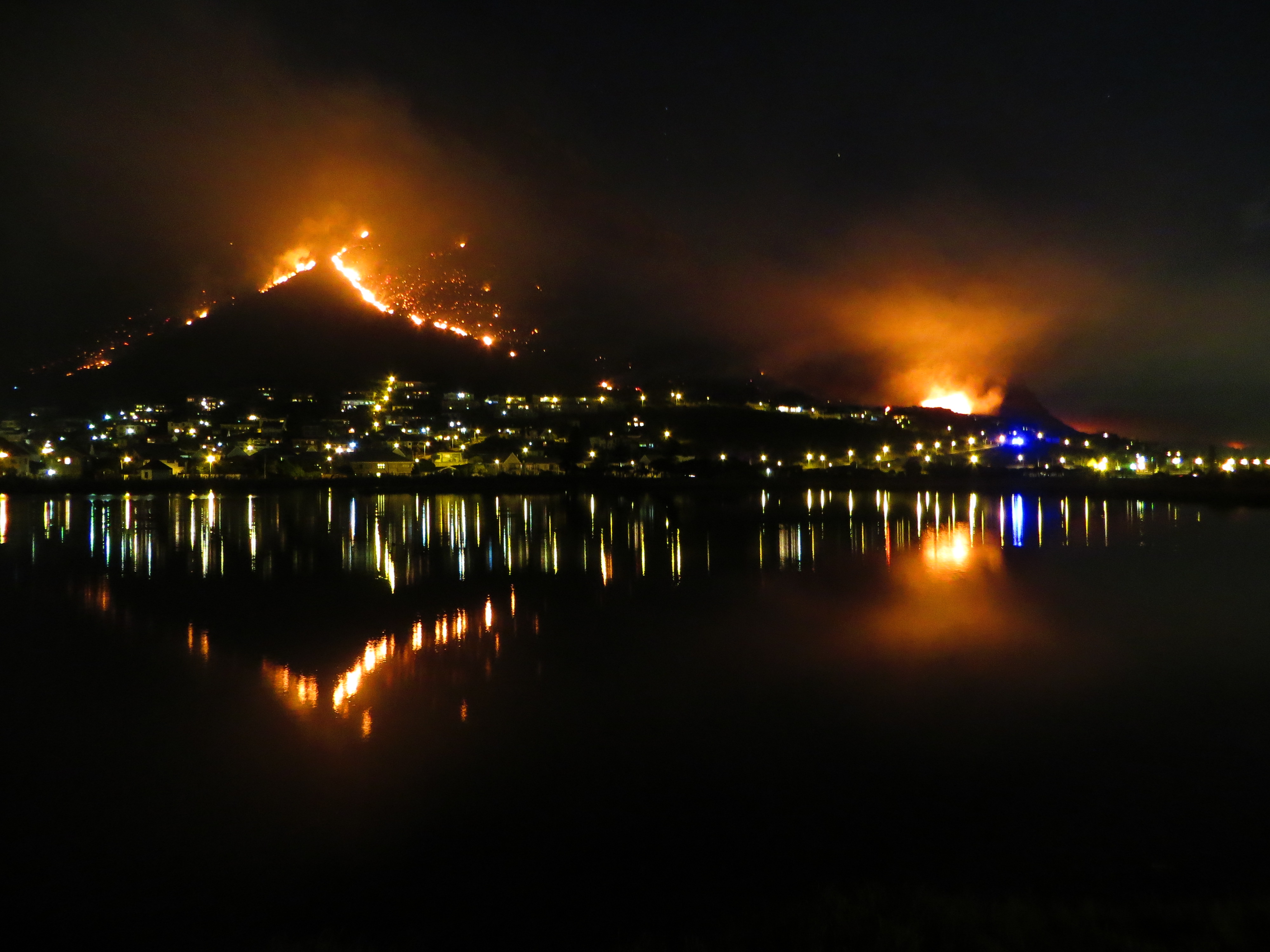 What we saw from our windows: A fire began on the mountains above our seaside town one Sunday morning. By sunrise four helicopters were attempting douse the flames with their hanging buckets, the South Easter wind was howling. Then the helicopters disappeared but flames kept creeping down the slopes. We heard rumors that the fire had blown over into the next valley and was traveling fast. Perhaps the fire crews went there? For the rest of that day we watched the fire burning on our Muizenberg mountain. At night, we watched from our lounge window the flames making a beautiful, frightening display, and the show went on for 4 days. The South Easter wind, fanning the flames onto the dry Fynbos and wooded slopes. By the 4th day, it had eaten 5000ha of the Table Mountain park and we in the town were experiencing a state of emergency. Or a state of emergence: an awakening.