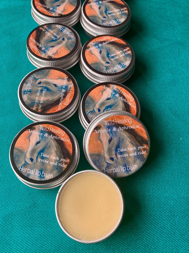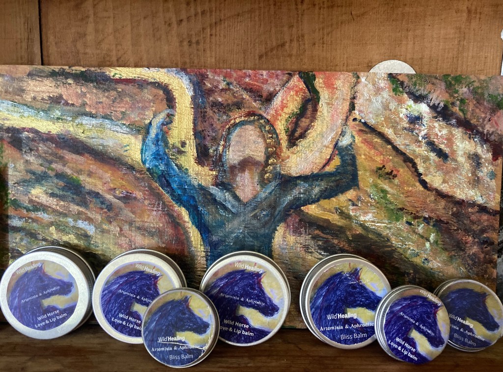 My journey of self healing forced me literally back down to earth, and I have to draw on my own resources and find support around me. Firstly I had the opportunity to test out my own medicine- a balm I had made. I had created a Bliss balm- by infusing Artimisia from the Karoo into oils and raw Shea and cacao butter. I had invented a Bliss Balm for massage and for healing aches and pains. Artimisia is also known to be an aprhrodisiac an anti-inflammatory and a natural anti-histimine when used topically. Ironically I had created a label for my product out of a doodle I had made of a wild horse looking backwards. That was me. That balm was the one that helped more than anything on my wounded neck. How amazing that I had already invented my own medicine!